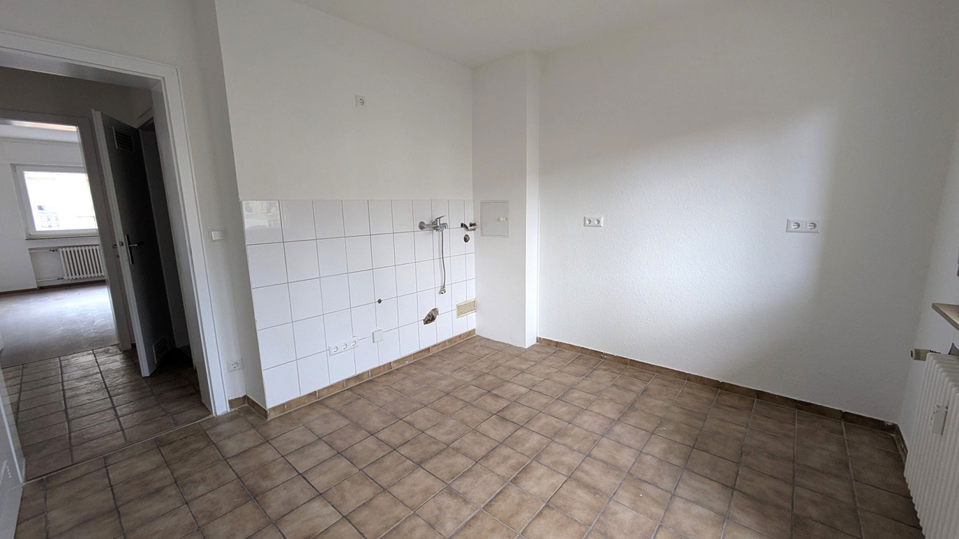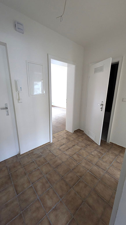 Diele und Küche gefliest, Zimmer mit neuem Laminatboden, Elektrik neu, weiss gefliester Sanitär, Wasseruhren vorhanden, Waschmaschinenanschluss ist in der Küche. Die Türen und Türzargen sind frisch gestrichen. Die Treppenhausreinigung ist fremdvergeben und in den Nebenkosten enthalten ebenso wie Wasser/Abwasser, Müll, Heizung, Versicherungen und Grundsteuer.